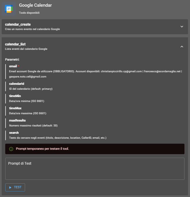Espandendo un tool vedrai i parametri richiesti e un'area di test. Scrivi un prompt di prova e clicca TEST per verificare il funzionamento. Ricorda: il plugin deve essere prima configurato!