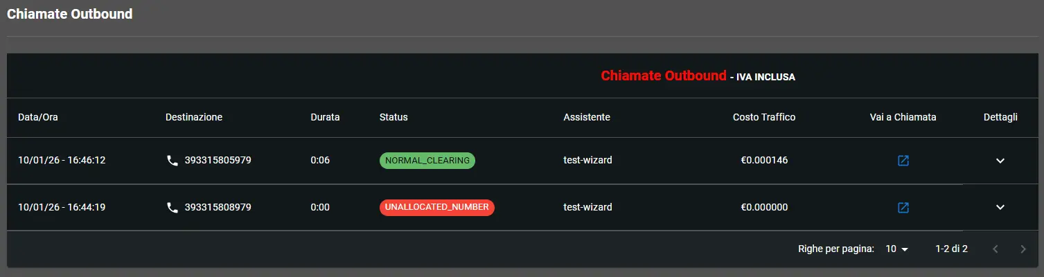 Nelle Chiamate Outbound, invece, sono visibili tutte le chiamate originate dal sistema, con il relativo esito (risposta, mancata risposta, occupato, ecc.), anche se successivamente la chiamata è stata presa in carico dall’assistente AI.