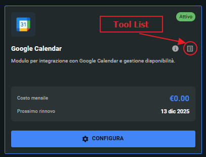 I Tools sono le funzionalità specifiche che ogni plugin mette a disposizione del tuo assistente AI. Ad esempio, un plugin per Google Calendar può avere tools per creare eventi, verificare disponibilità o elencare appuntamenti. L'assistente AI utilizza automaticamente questi tools durante le conversazioni con i tuoi clienti.
