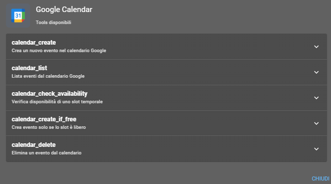 Vedrai l'elenco completo con nome e descrizione di ogni tool. Clicca su uno di essi per espanderlo e vedere i dettagli.